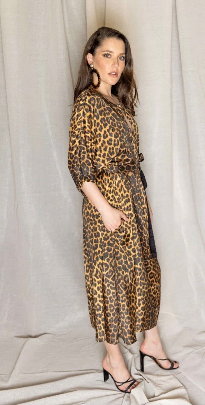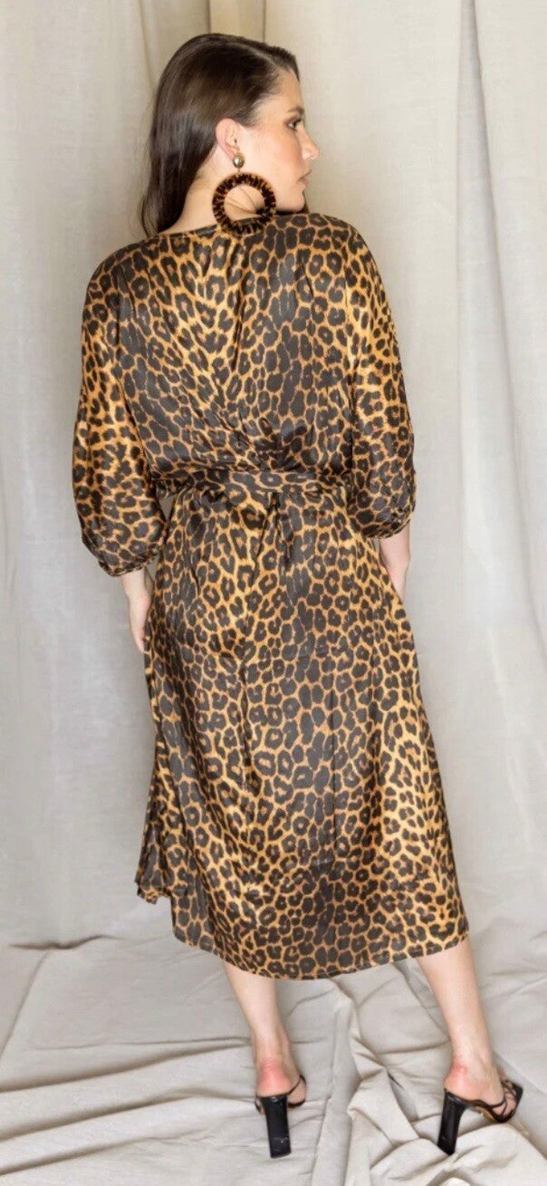 Unleash your wild side with this stunning leopard print midi dress! Featuring a relaxed yet ultra-chic silhouette, flowy sleeves, and a flattering waist tie, this dress is perfect for making a bold statement at any event.